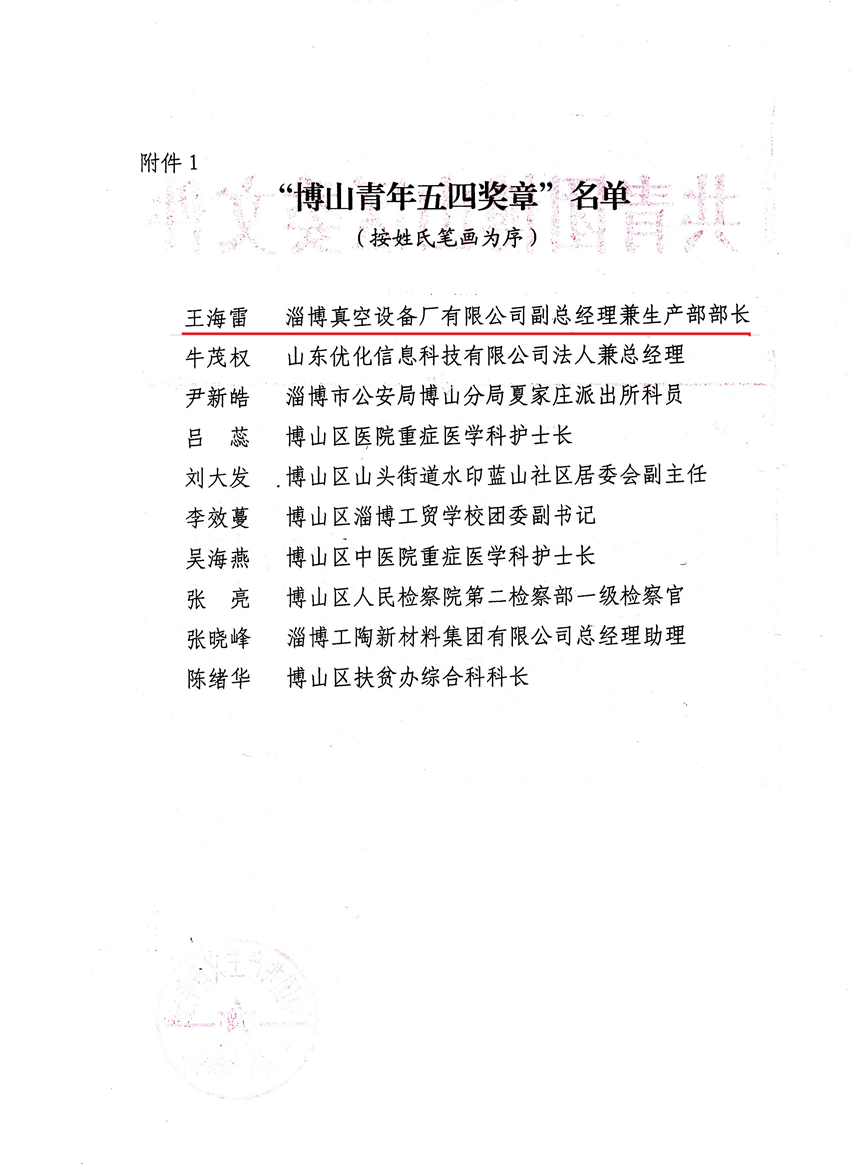 2020年4月30日,共青團(tuán)淄博市博山區(qū)委員會組織召開了“綻放戰(zhàn)役青春  堅(jiān)定制度自信”主題宣講暨優(yōu)秀青年事跡分享會。區(qū)委常委、組織部部長楊發(fā)磊,副區(qū)長李林出席會議。會上授予我公司員工王海雷等10名同志“博山區(qū)青年五四獎?wù)隆睒s譽(yù)稱號。